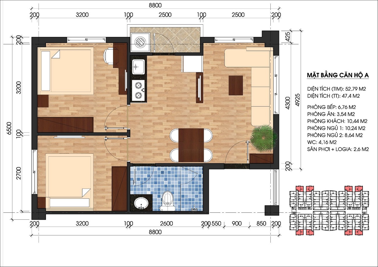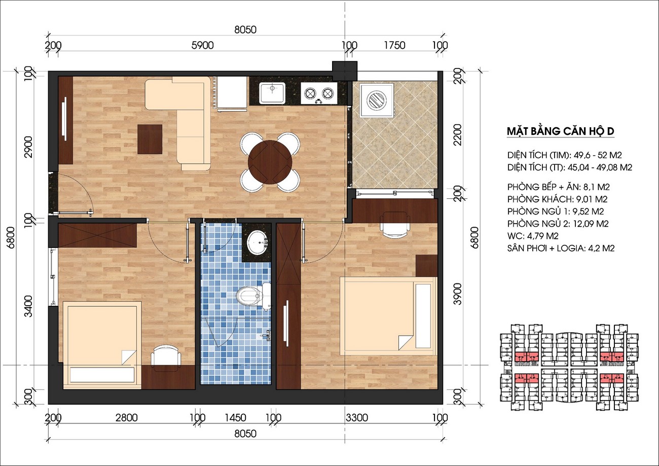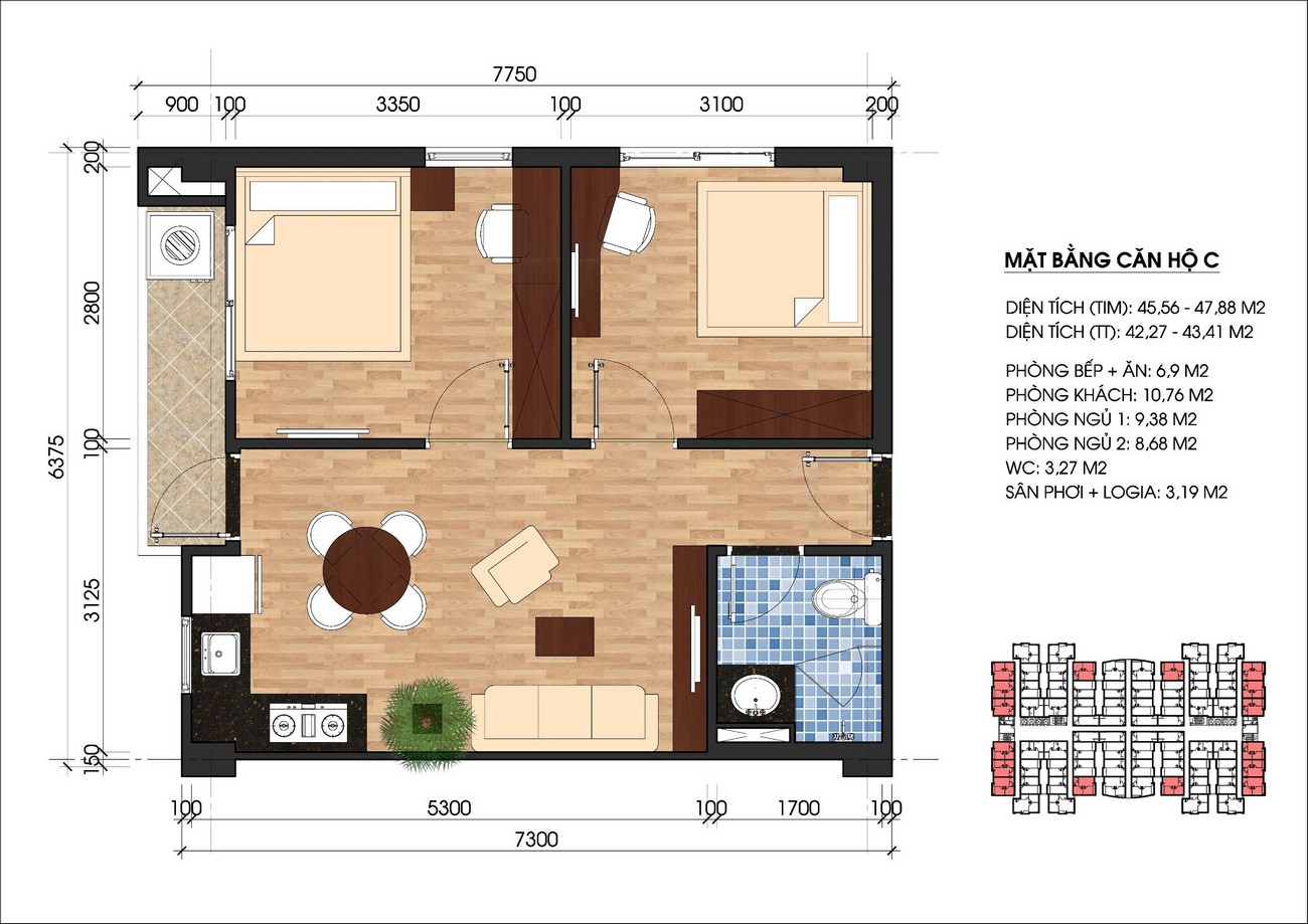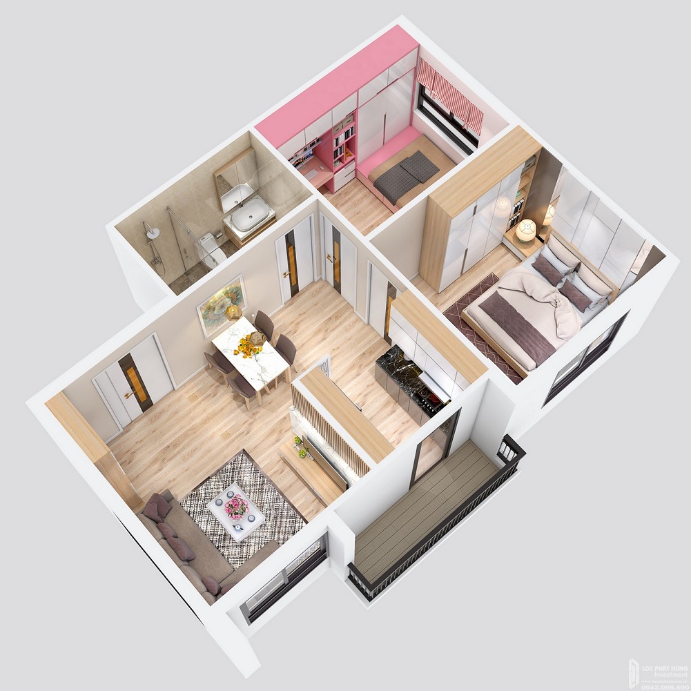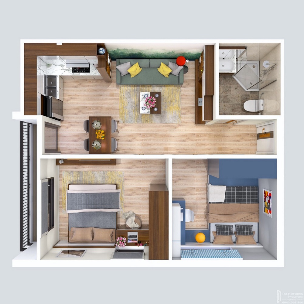 • Căn hộ 2 phòng ngủ: bố trí hợp lý, không gian sinh hoạt, nghỉ ngơi tách biệt, phù hợp cho gia đình trẻ