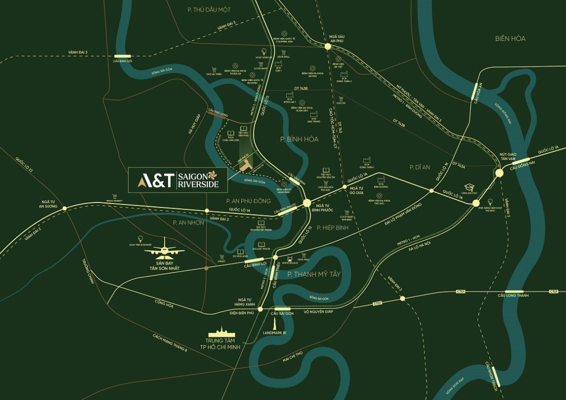 A&T Saigon Riverside là dự án căn hộ cao cấp ven sông Sài Gòn, được kiến tạo như một dấu ấn mới về phong cách sống hiện đại, sang trọng và bền vững. Tọa lạc ngay cửa ngõ kết nối TP.HCM và Bình Dương, dự án không chỉ sở hữu vị trí chiến lược thuận tiện di chuyển mà còn mang đến không gian sống gần gũi với thiên nhiên, nơi cư dân có thể tận hưởng sự bình yên bên dòng sông xanh mát ngay giữa lòng phố thị sôi động.