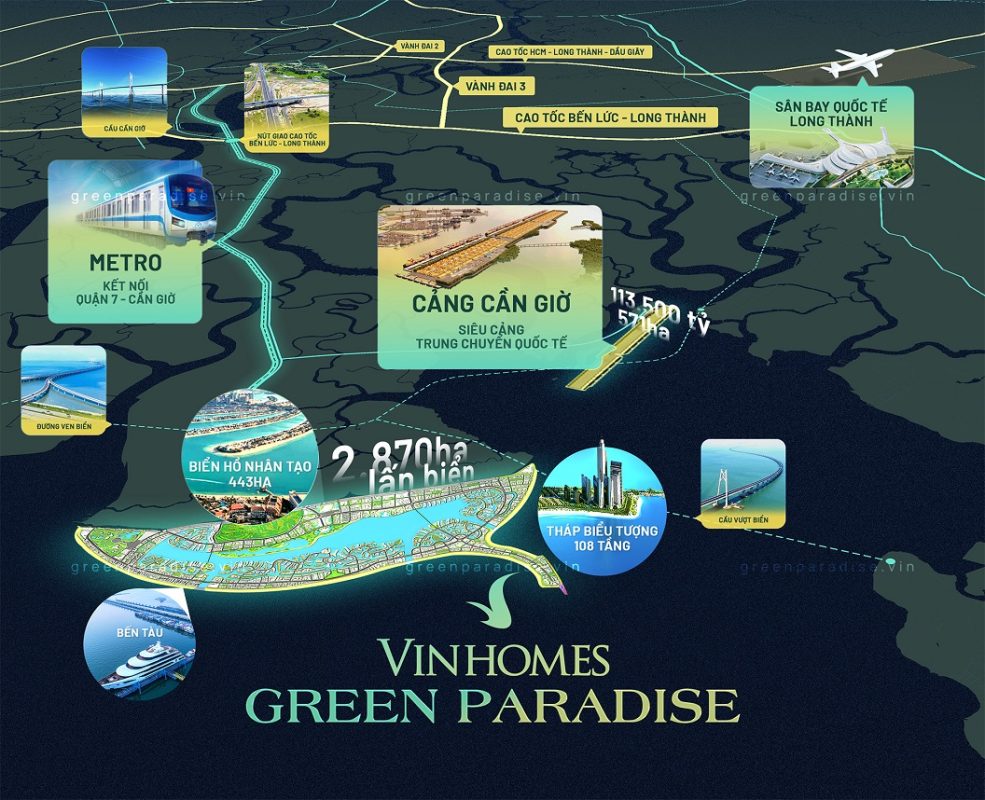 Vinhomes Green Paradise Cần Giờ được quy hoạch bài bản trên quỹ đất rộng gần 2.870 ha, định hướng trở thành siêu đô thị biển xanh thông minh đầu tiên của TP.HCM. Dự án là sự kết hợp hoàn hảo giữa không gian sống hiện đại và hệ sinh thái tự nhiên, mang đến một môi trường sống cân bằng, trong lành và đầy tiềm năng phát triển.